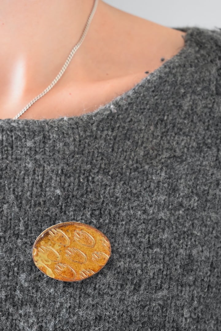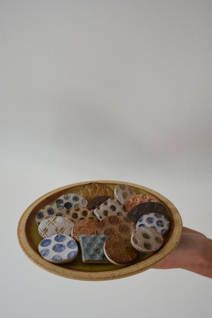 Made from iron-rich speckled stoneware, stamped and finished with a choice of glaze and a stainless steel clasp.
