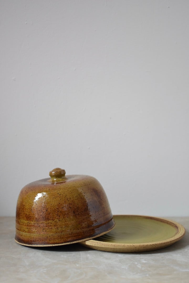 Wheel thrown butter-dish made from iron-rich speckled stoneware and finished with a honey glaze.