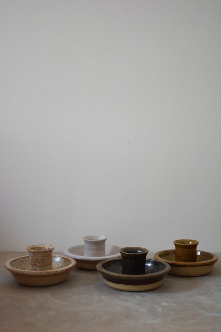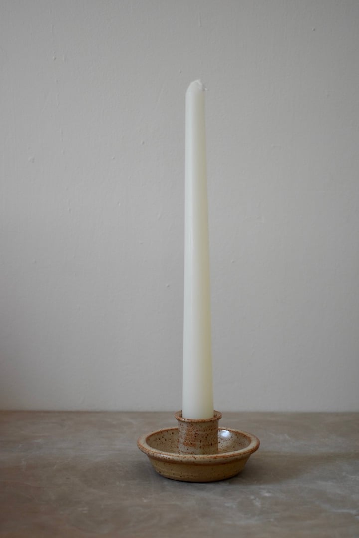 Wheel thrown candle holder with dish suitable for a standard dinner candle, made from iron-rich speckled stoneware and finished with a choice of glaze.
