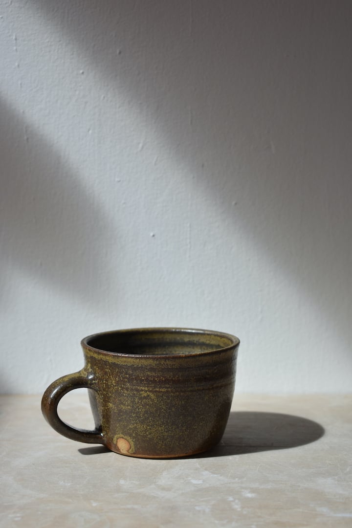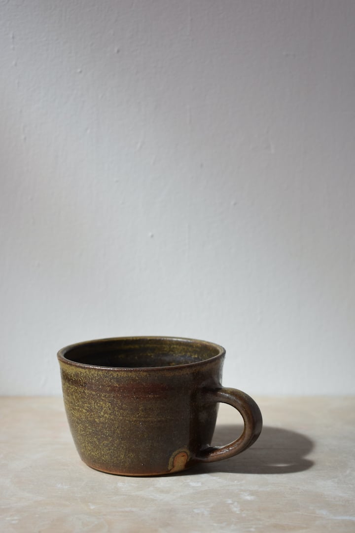 Wheel thrown cup made from iron-rich speckled stoneware and finished with a lichen glaze.