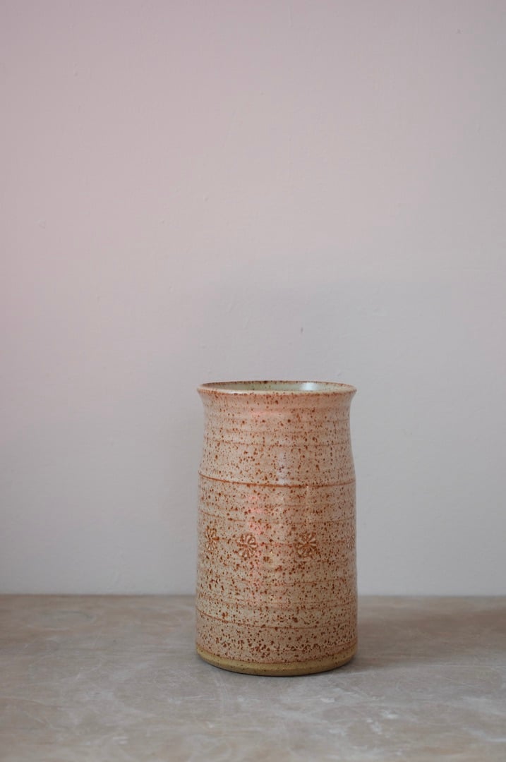 Wheel thrown vase made from iron-rich speckled stoneware and finished with a shino glaze.