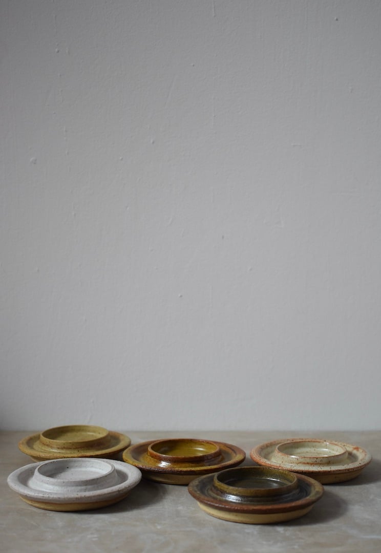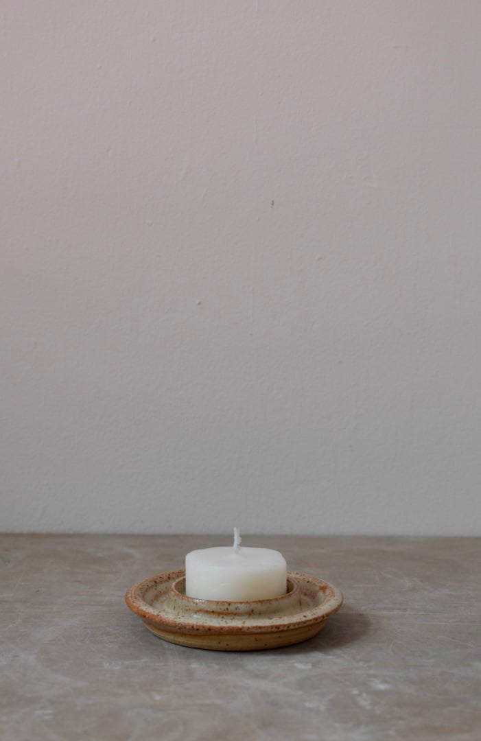 Wheel thrown tealight holder with dish suitable for a standard tealight candle, made from iron-rich speckled stoneware and finished with a choice of glaze.