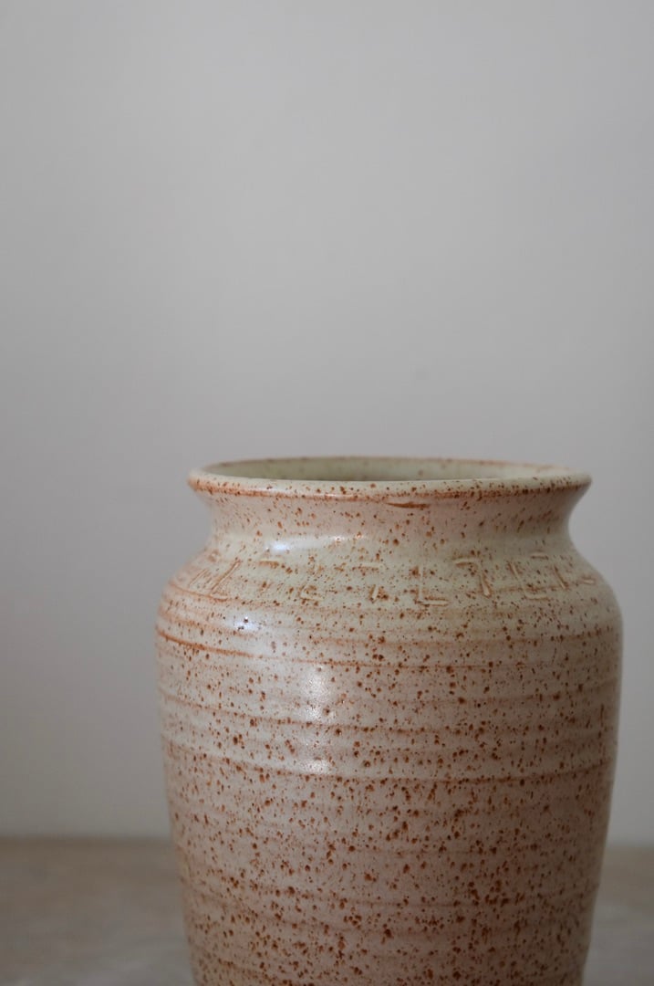 Wheel thrown vase made from iron-rich speckled stoneware and finished with a shino glaze.